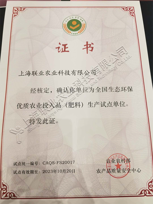 我司荣获首批全国生态环保优质农业投入品(肥料)试点单位。