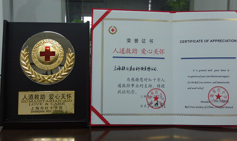 2013年1月6日,上海联业农业科技有限公司参加2013年普陀区红十字会“千万人帮万家”迎春募捐帮困活动,我公司董事长助理刘东海,代表张国勤董事长到现场捐赠并接受上海市红十字会颁发的“人道救助,爱心关怀”荣誉证书和纪念碑。