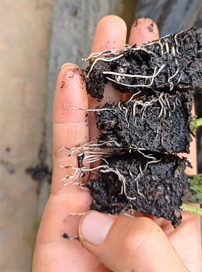 结合人参果的生长特性,以及能够达到更好的生根、壮株效果,育苗池的肥液采用根千条加易补磷组合。腐殖酸与磷元素在促进根系生长的同时,也能够壮大苗木的株茎,控制旺长。再者就是该组合还能加速茎叶的木质化过程,有效提升苗期的抗病能力。使用该组合半个月后,人参果苗势头好、长势整齐、叶片深绿、根系粗壮发达。