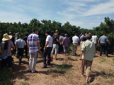 2017年9月25日上午,在新余市果业局的协助和组织下,我公司和陶氏益农公司在新余市姚圩镇针对新余蜜桔召开了一场推广会。会上来了将近100多位果农朋友,我们查看了现场会,果农对陶氏益农的大生防治蜜桔黑点病效果非常不错!