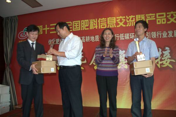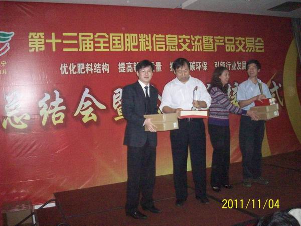 2011年11月,在第十三届全国肥料双交会上,我公司张国勤董事长为河南省土肥总站王俊忠站长颁发一等奖!