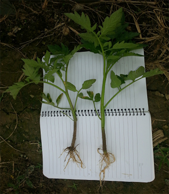 上海联业广东区域的销售团队前期在东莞市茶山镇周边,进行了“谷霖”生物有机肥作底肥、移苗后淋施根千条2次的产品示范田;示范田的番茄苗主茎粗壮、根系也十分健壮,地上部分叶色浓绿,长势非常整齐,死苗非常少。